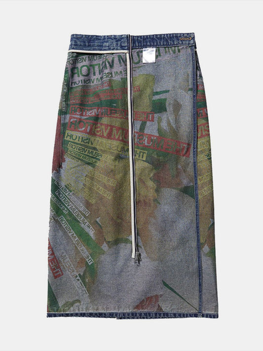 Reversible Slit Printed Midi Denim Skirt