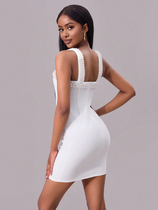 Pearl Detail Square Neck Wide Strap Mini Dress