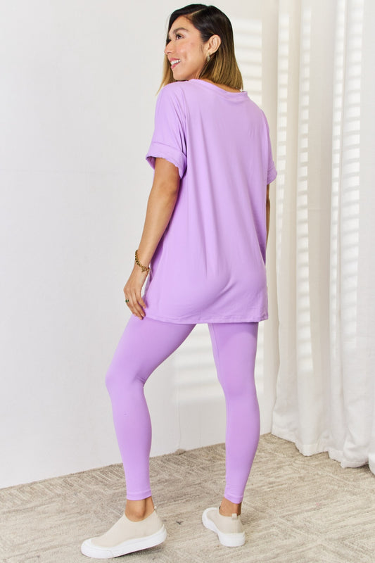 Zenana V-Neck Rolled Short Sleeve T-Shirt and Leggings Set